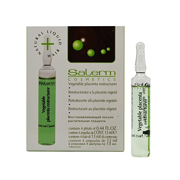 Salerm Vegetable Placenta Restructurer This treatment combines in a single hydoalcoholic therapy cellular growth factors & proteins from purified soy & aloe vera enriched with sulphured amino acids and a combination of 3 plant extracts (thyme rosemary & bergamot). In addition to recognised generating & stimulating effects on the capilary fibres & scalp this Salerm Placenta Vial provides decongestive stimulating epithelising & antiseptic actions. Also contains a cationic filmogen which creates a film on capillary fibers giving nerve & shine to debilitated hair. The result is an effective treatment which improves cellular respiration reactivates metabolism & stimulates blood circulation in the scalp promoting the formulation of new hair & nourishing debilitated and/or split hairs.